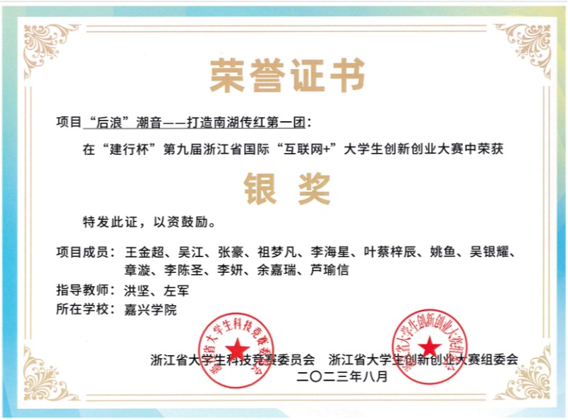 《后浪“潮”音——打造南湖传红第一团》获第九届浙江省国际“互联网+”大学生创新创业大赛银奖
