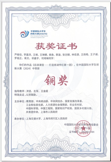 《后浪潮音———打造南湖传红第一团》获得中国国际大学生创新大赛(2024)国赛铜奖、浙江省省赛金奖